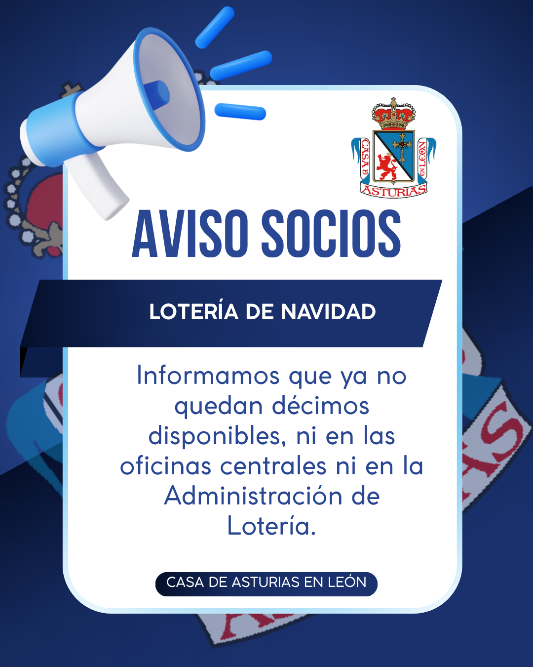 LOTERÍA DE NAVIDAD – AGOTADA 11/11/2025 Informamos que ya no quedan décimos disponibles, ni en las oficinas centrales ni en la Administración de Lotería. ¡Gracias por vuestra confianza y mucha suerte a todos los que ya tenéis vuestro número!