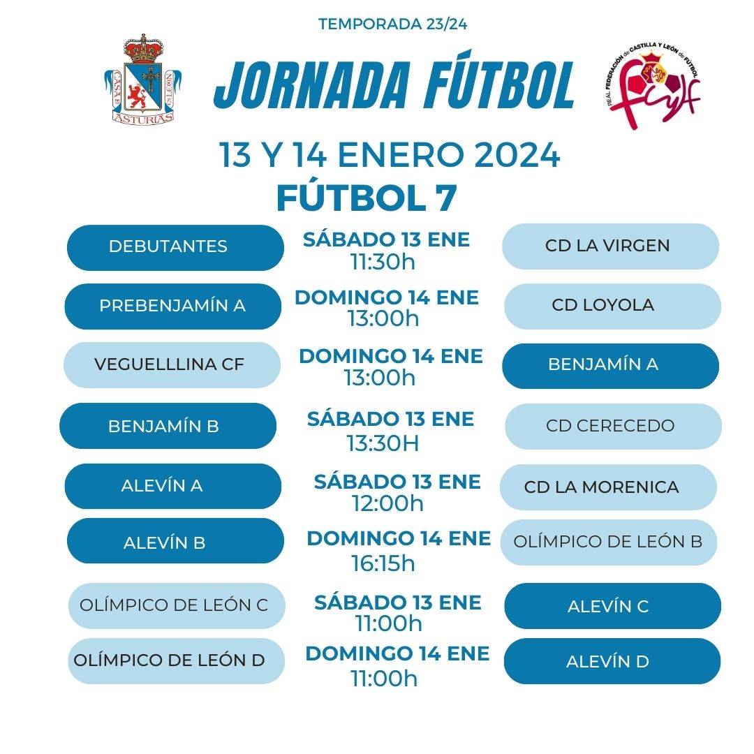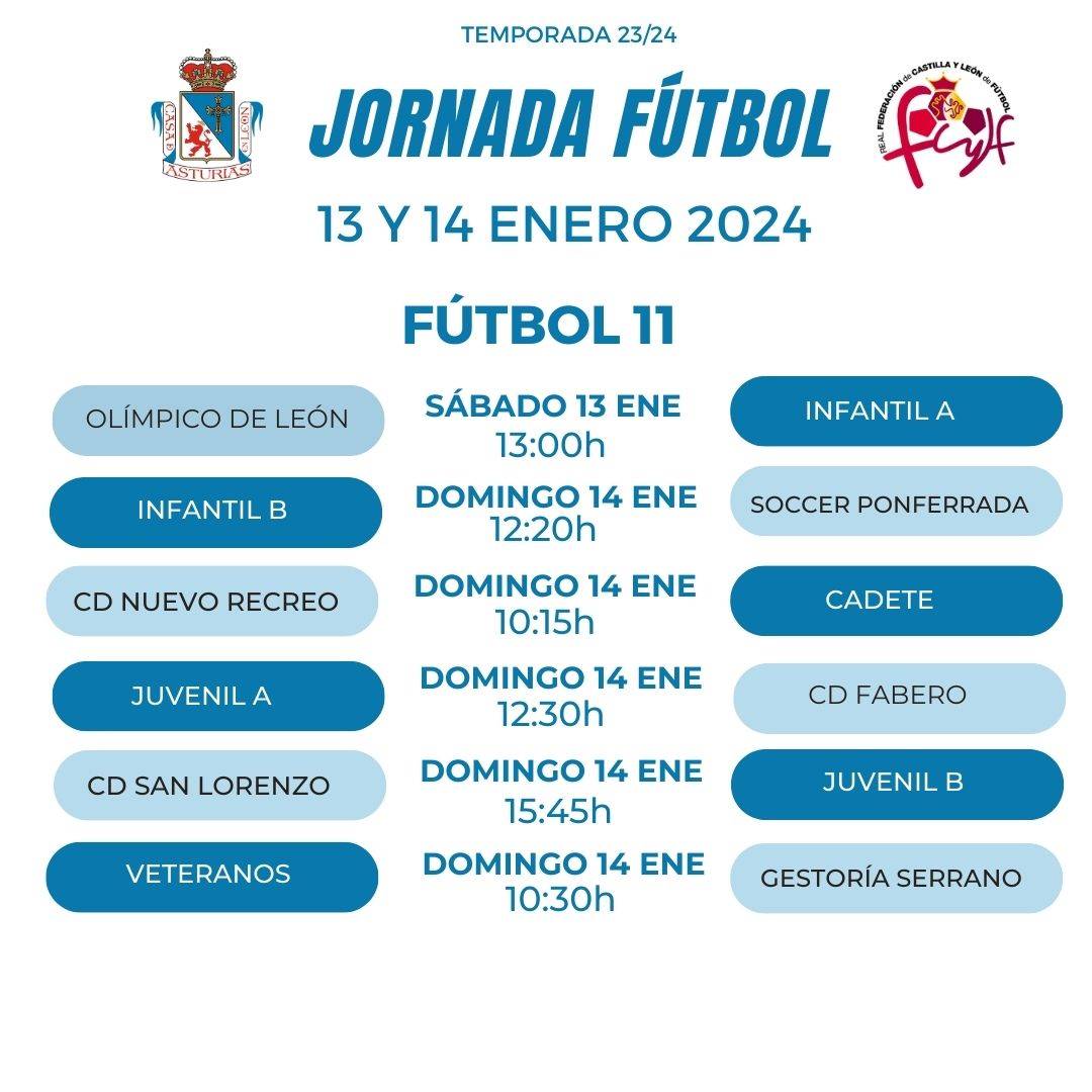 Horarios del fin de semana de los equipos de fútbol (13 y 14 enero) 11/01/2024 Estos son los horarios de nuestros equipos de fútbol para la jornada de este fin de semana (13 y 14 de enero), la primera de 2024. ¡Mucha suerte a todos!